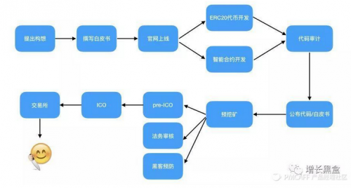 因为ICO项目在国内已经被禁止了,所以本文只讨论国外的ICO营销策略。开始之前,我们需要先了解一下ICO的发布流程,请看下图(以ERC20项目为例)